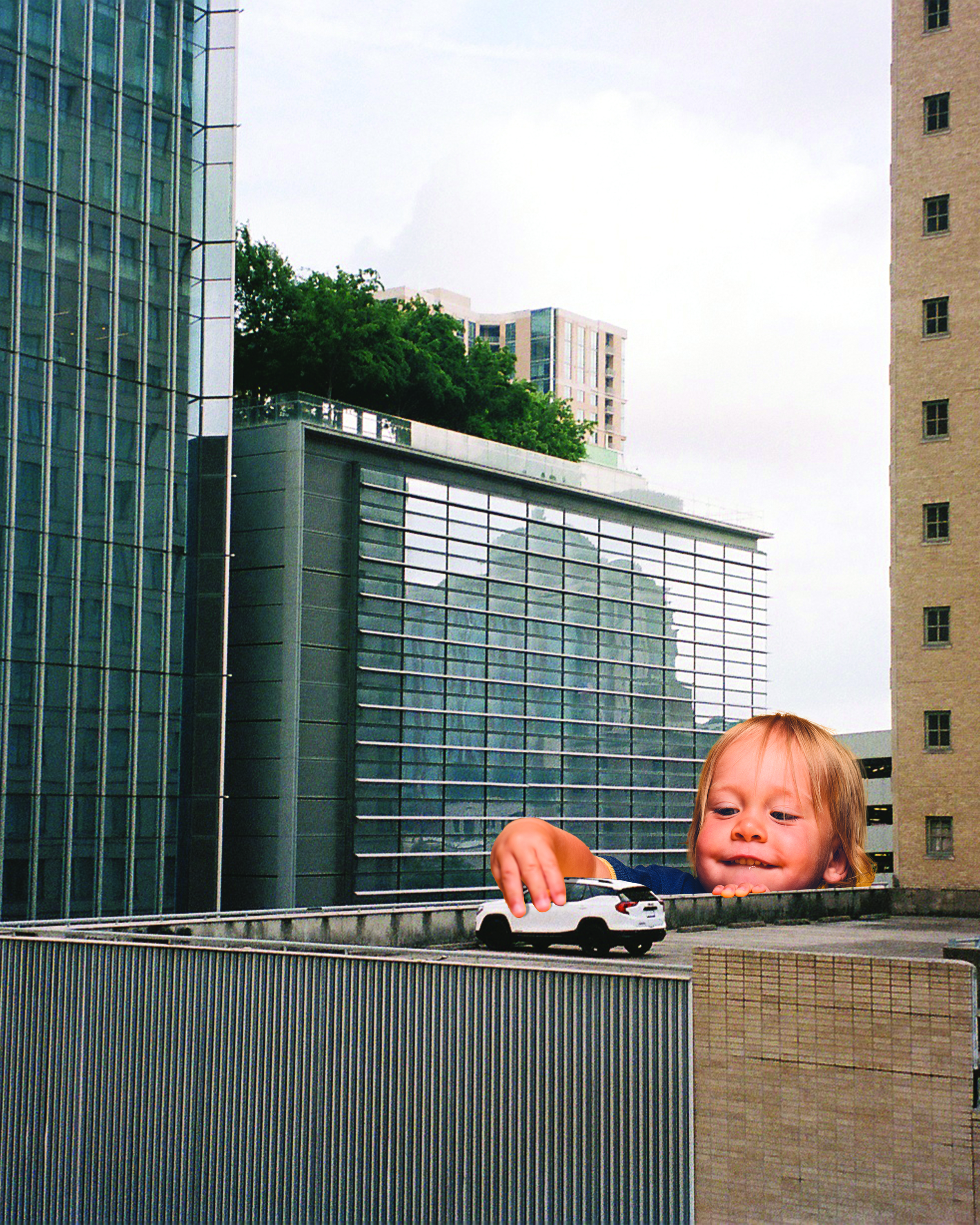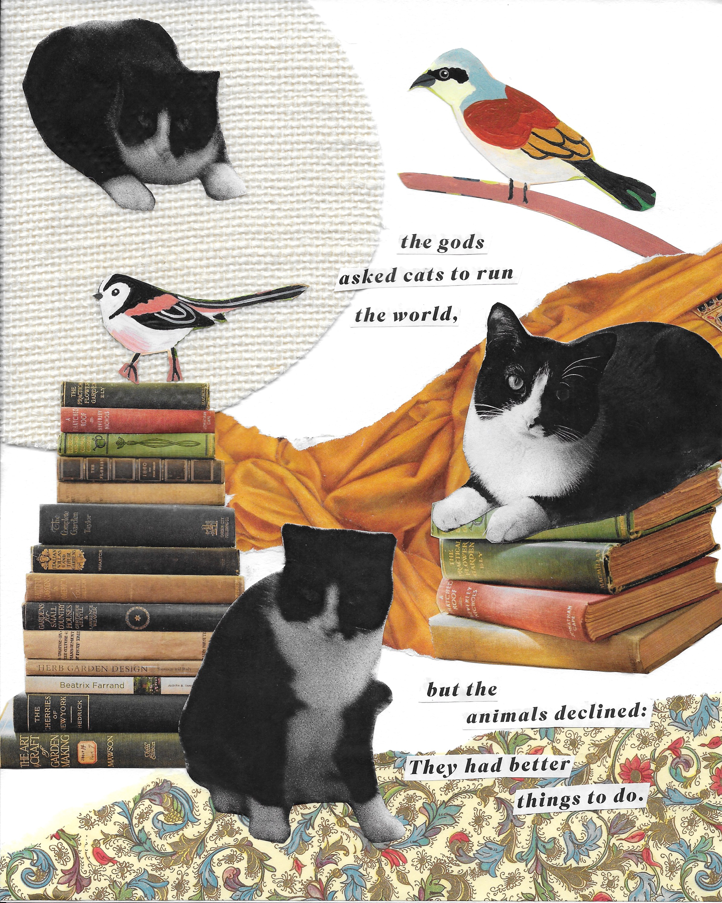 A series of collages hang on the office wall of Houston Grand Opera Graphic Designer Rita Jia. She assembled them from magazine cutouts and photos she took herself. In one, a boy the size of a Houston parking garage plays with a full-sized car, as if it were a toy. Another depicts Jia’s tuxedo cat Luna sitting on a stack of books, surrounded by the phrase, “The gods asked cats to run the world, but the animals declined: They had better things to do.”